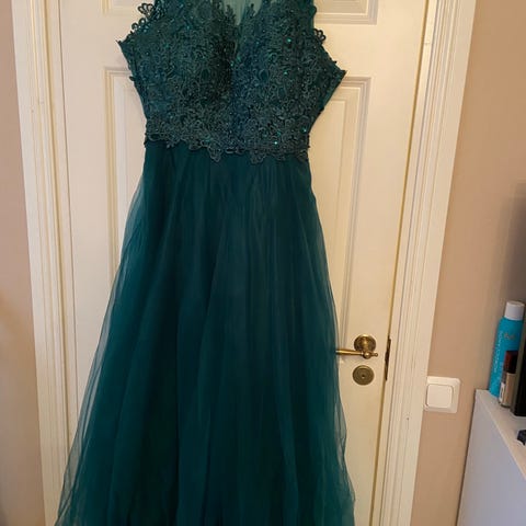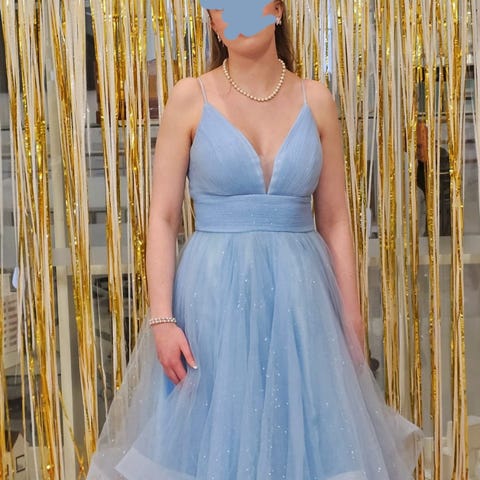 Kerran tanssittu sininen vanhojentanssi mekko. Mekossa on glitterinen kukka kuvio. Koko M, mutta mekkoa pystyy kiristää/väljentää helposti takaa löytyvillä nyöreillä. Mekko oli sopivan pituinen 170 cm tanssijalle matalilla kengillä, mutta varmasti on sopiva myös pidemmälle tanssijalle. Mekon päällimmäistä kerrosta on itse lyhennetty hieman ja päällimmäisen kerroksen helman alaosassa saattaa olla pieniä käytön jälkiä. Muuten mekko on erinomaisessa kunnossa.
