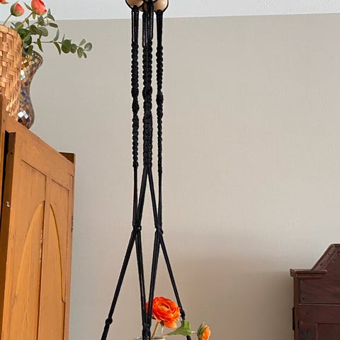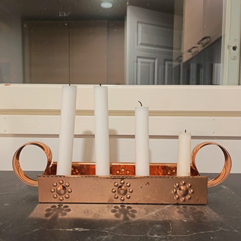 Kuparinen amppeli. Yhden ketjun kiinnityskoukku lähtenyt irti.