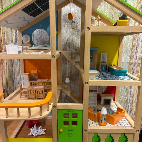 Hape-nukkekoti, jossa Hape-merkin puiset nuket (6 kpl: isä, äiti, poika, tyttö, mummo ja vaari) ja Hape-kalusteita. Myös muita kalusteita, kaksi pikkutyttöä ja kaksi vauvaa. Kaikki osat ehjiä, puhtaita ja siistejä.