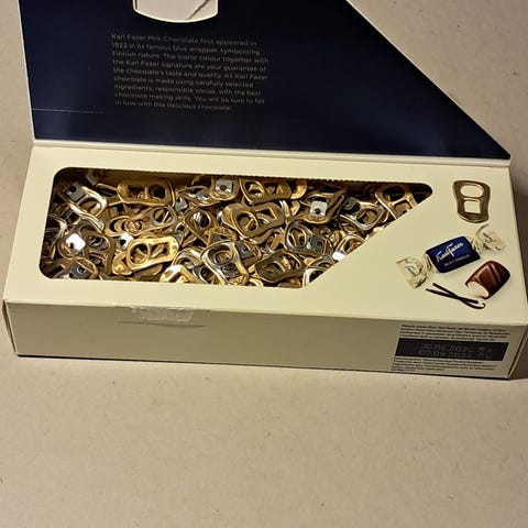 Käsitöitä harrastavalle kaksi laatikollista hopean värisiä juomatölkin nipsuja