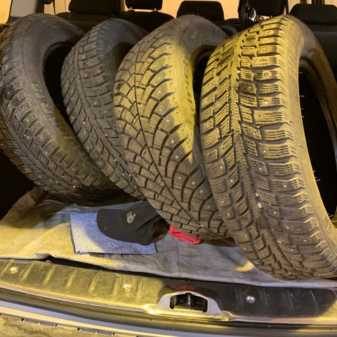 Kaksi rengasta. Nastoja vain jokunen lähtenyt. Kulutuspinta 8mm