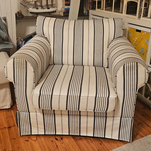 "Kensington" lepotuoli 70-luvulta, joka on uudelleen verhoiltu verhoilijalla 90-luvulla. Viime kesänä tekstiilipesurilla pesty. Siisti. Istuimen korkeus 48, syvyys 52 ja leveys 48. Selkänojaan sekä käsinojiin suojat ja niskatyyny.
