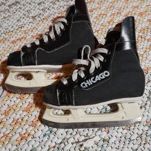 Muutama kertaa käytetty maila ja 3 lasten kiekkoa.