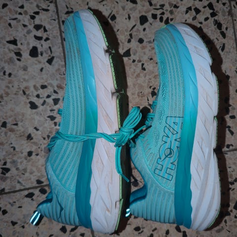 Hoka One One juoksukengät koko 43, väriltään harmaa. Sopivat juoksuun, tarjoavat tukea ja mukavuutta juoksuharjoituksiin ja -kilpailuihin.