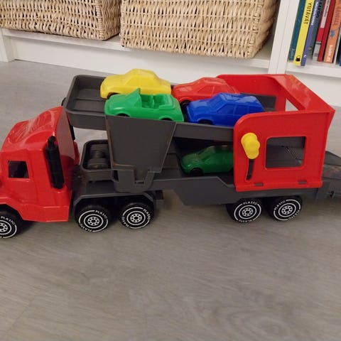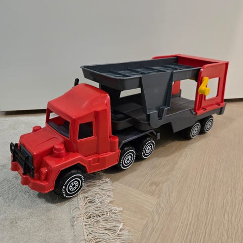 Plasto autonkuljetusrekka. Nostolavan säätövipu toiselta puolelta murtunut, mutta lava nousee ja laskee tästä huolimatta normaalisti.