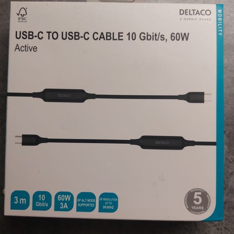 Laadukas USB type-c johto jossa kulkee 5A virta 240W teholla, sekä dataa hulppeat 40 Gbps. Videota saa puskettua 8K/60Hz tai 4K/120Hz.