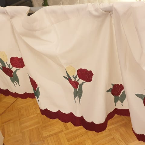 Jotex joulukuvioinen verhot, jossa valkoinen pohjaväri ja punaiset joulupukin hatut. Materiaali puuvillaa, sopii joulunajan kattaukseen. Koko ja tarkemmat Leveys 40 , Korkeus 205cm.