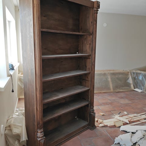 Myynnissä ruskea puinen hylly, jossa on lasikaappi.