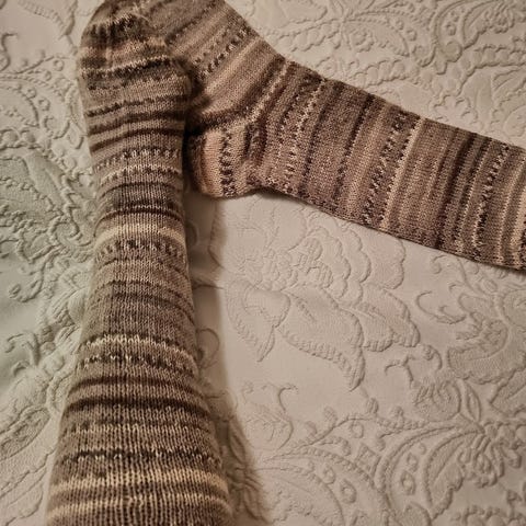 Dropsin pehmeän suklaan värisellä (print-kuvio)langalla (75% villa, 25% polyamidi) kudotut pitkävartiset sukat, joissa sivulla reikäkuvio pienillä helmillä. Mitat: varsi 30cm, jalkaterä n. 24cm.