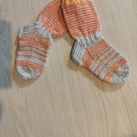 Käsintehdyt villasukat valmistettu Novita villalangasta. Koko n 26, jalkaterän pituus n 17 cm. Väriltään raidalliset ja moniväriset, sopivat lapsille. Sukissa joustava resori ja jalkaterä sekä vahvistetut kantapää.