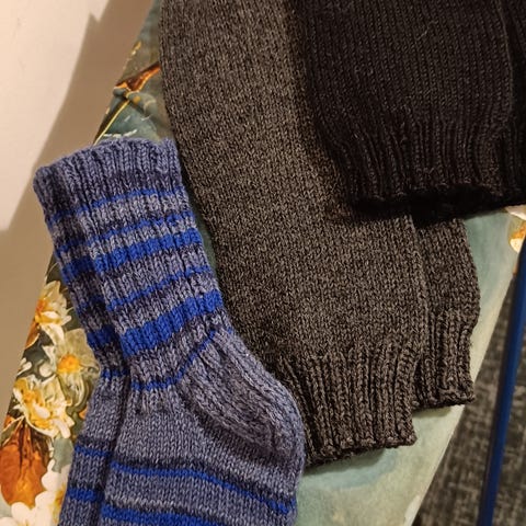 Sammaleen vihreät pitkät kauniit säärystimet ja samasta langasta kämmekkäät ja sukat. Sukissa sama lanka, mutta eri erä, joten sukissa sävyero. Sukat koko 40-41. Säärystimien pituus 59 cm., kuvion johdosta venyy hyvin. Yhteishinta. Voi ostaa myös erikseen.