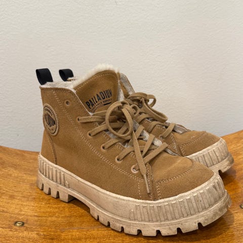 Itselläni on muita Palladium-kenkiä: 37 ja 38. Näköjään tuo paksu vuori pienentää kengän sisätilaa niin, että leveään jalkaani ne ovat pienet.