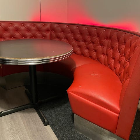 Kahden istuttava sohva. Valmistettu oikean Minin rungosta, joka on maalattu vihreäksi ja siinä on harmaa verhoilu. Takaluukussa baarikaappi. Sopii esimerkiksi kodin, autotallin, miesluolan, mancaven tai kerhotilan sisustuselementiksi. Mukaan 2kpl renkaita.