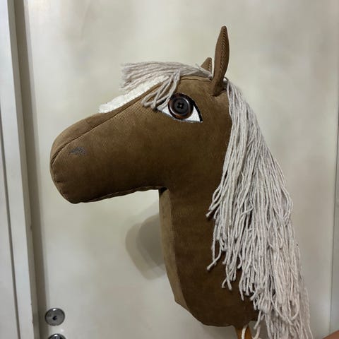Muuten erinomaisessa kunnossa oleva keppihevonen, mutta hevonen ei hirnu koska paristo on loppuun käytetty.