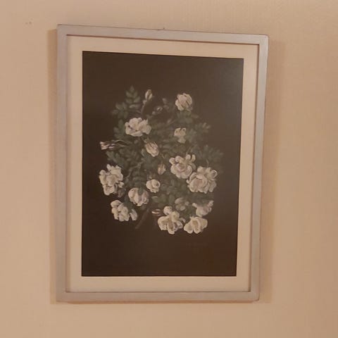 Katri Markkasen 1997 tekemä taideteos villit ruusut. Pikkutarkka, näyttävä. Koko 21x21 cm. Lasi kehys. Ripustus.