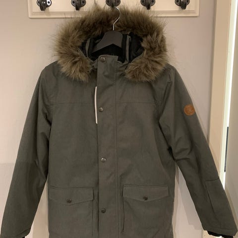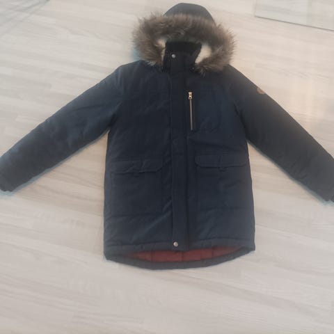 Name It talvitakki. Koko 152. Ihanan muhkea ja lämmin. Juuri pesty. Ainoat moitteet molemmissa hihoissa alasaumassa (piilossa, ei näy käytössä) pientä kulumaa ja joku huomaamaton tahra edessä. Näkyy, kun osaa katsoa oikeassa valossa. Väri lienee siniharmaa, parhaiten oikea väri näkyy viimeisessä pesulappukuvassa.