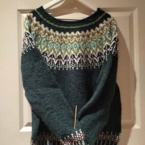 Islanninvillasta (Alafosslopi) neulottu neule. Malli on Villahullun Alppineule, jonka lisenssimaksu maksetaan, jos kaupat syntyvät.