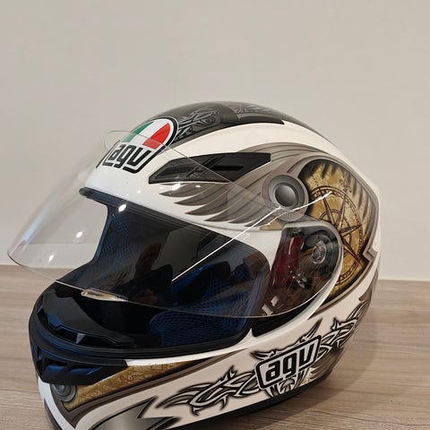Agv moottoripyöräkypärä, kuvissa pölyinen kun ollut pitkään käyttämättä. Koko Xs.