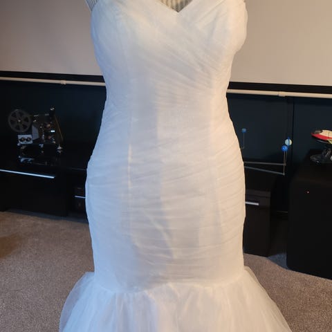 Käyttämätön, vain paristi sovitettu mekko. Oli itselle lopulta liian lyhyt kenkien kanssa (olen 177cm pitkä). Käy lyhyemmälle mainiosti!