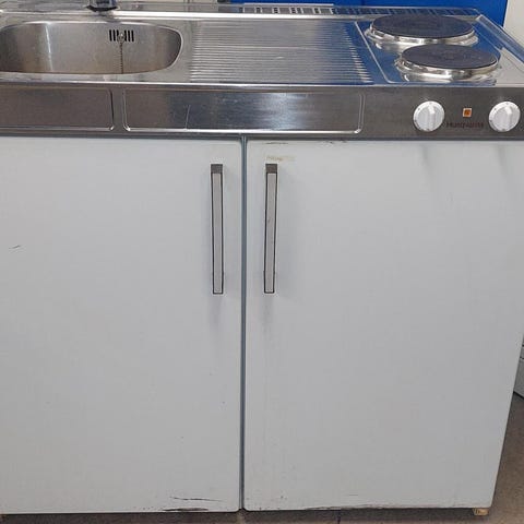 Keittiöyksikkö, jossa kaksi sähköistä keittolevyä ja pieni tiskiallas hanalla. Yksikkö on valkoinen ja sisältää alakaapit, joissa säilytystilaa. Sopii pieniin tiloihin tai tilapäiseen käyttöön.