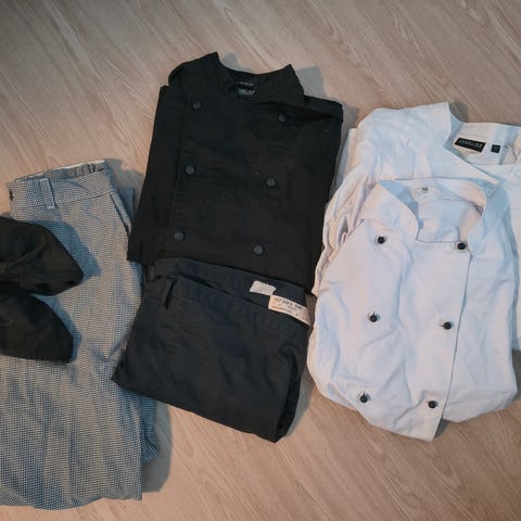 Takin koko 62. Housut 60. Koko ja puoli esiliina. Jalas turvasandaalit koko 46.