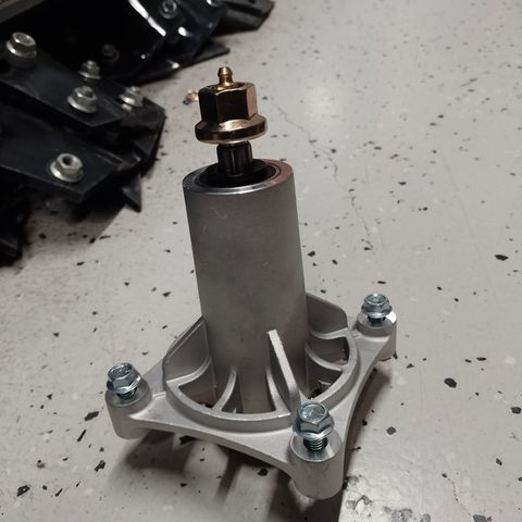 AI: Spindle Assembly, varaosakomponentti. Sisältää pyörivän akselin ja jäähdytyselementin. Käytetään esimerkiksi ruohonleikkureissa tai muissa vastaavissa laitteissa.