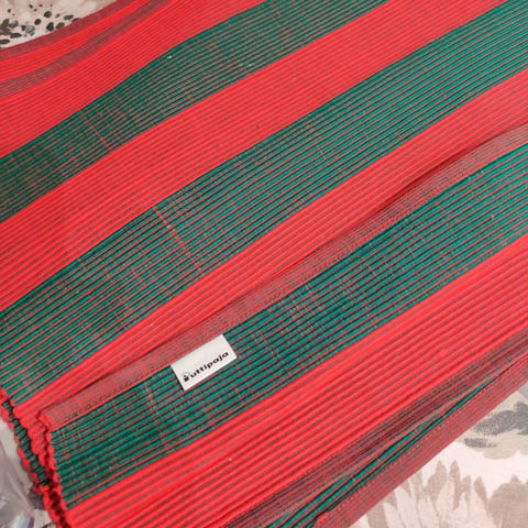 Jouluaiheinen keittiötekstiilisetti puuvillaa, sisältää joulukalenterin, esiliinan, neljä pöytätablettia, joulutyynyliinoja 5 kpl, joulusukka ym. hinta yhteensä 100 e. Värit ovat punainen ja valkoinen, ja kuviot koostuvat ruutukuvioista. Soveltuu käytettäväksi joulun ajan sisustukseen.