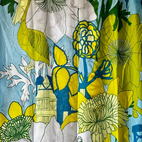 Siistiä ja hyväkuntoista Heinä -kangasta verhoksi ommeltuna (kaikki reunat). Värinä on tummempi sininen. Samanlaisia paloja on 2 kpl.