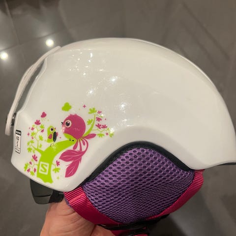 Salomon Kid M kypärä, koko 53-56 cm. Kypärässä on ilmanvaihtoaukot ja pehmustettu sisäosa mukavuutta varten. Sopii lasten käyttöön ja tarjoaa suojaa pään alueelle erilaisissa aktiviteeteissa.