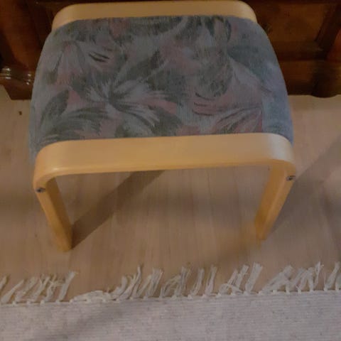 Vintage jakkara tai jalkarahi, jonka jalkaosa on metallia/messinkiä ja pääliosa puuta. Jakkara on neliön muotoinen. Jakkaraan kuuluu myös pehmustettu plyyshiverhoiltu tyyny, joka on kaunis. Jakkara on vankka ja tukeva.