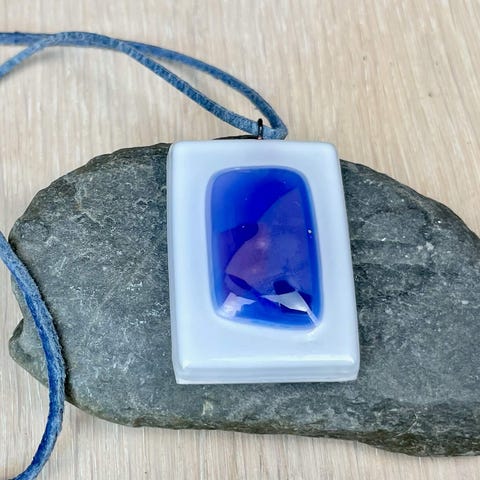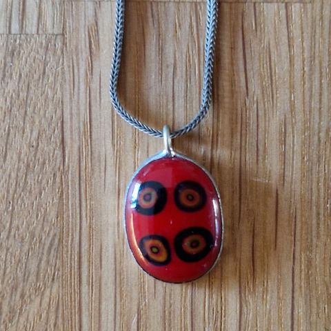 Kaunis käsintehty sulatettu lasiriipus (fused glass) punaisella keskiosalla ja valkoisella kehällä. Mukana punainen nauhaketju, jonka pituutta voi säätää solmulla. Uniikki, yksittäiskappale.