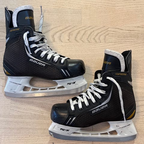 Käytön jälkiä on mutta ehjät. Tästä hyvät luistimet esim. ulkojääkäyttöön.