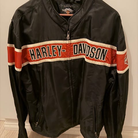 Harley-Davidson takki, vedenpitävä, koko 2XL, musta pääväriltään oransseilla yksityiskohdilla. Valmistettu kestävästä materiaalista, suunniteltu miehille. Takissa on vetoketjutaskut ja pehmustetut kyynärsuojat. Sopii moottoripyöräilyyn ja vapaa-ajan käyttöön.