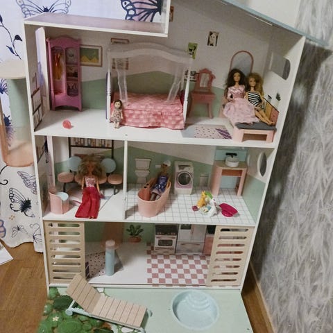 Paljon leikitty barbietalo uuteen kotiin. Lasten jäljiltä maalipisaroita ja tarroja voi löytyä, huomioitu hinnassa.