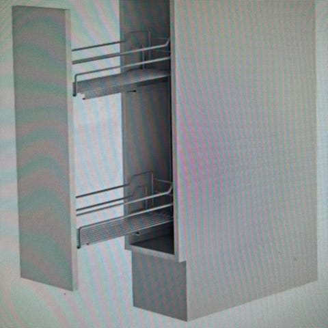 Metallinen hyllykkö, väriltään metalli. Soveltuu keittiön tai muun tilan säilytykseen. Hyllykkö koostuu useista tasoista, joissa voi säilyttää erilaisia elintarvikkeita tai muita tavaroita. Rakenteeltaan tukeva ja tilaa säästävä ratkaisu. Asennus komeroon jonka min. Syvyys 56,5cm, leveys 56cm ja kork. Minimi 18,3 cm. Kiinnitys komeron pohjaan ja sivuun. Kantavuus 70kg. Ovh. 1130 eur