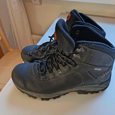 Merrell Vaelluskenkä mustassa värissä, koko 43. Kenkä on suunniteltu vaelluskäyttöön ja valmistettu kestävästä materiaalista, joka tarjoaa tukea ja mukavuutta ulkoiluun. Kunto hyvä, toisen kengän kärki hieman irronnut, siitä kuva.