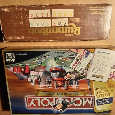 Vanha Rummikub peli, nappulat vähän kuluneet paljosta pelaamisesta.