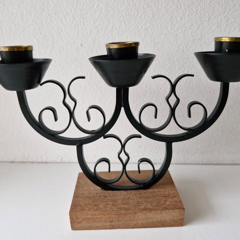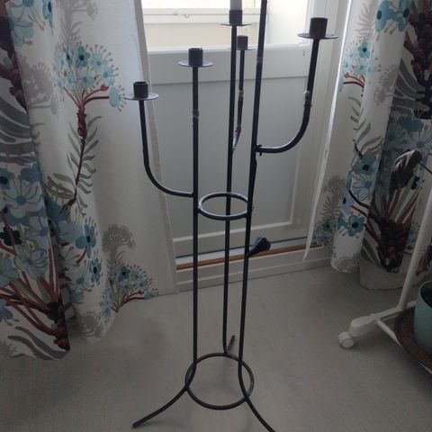 Käyttämätön metallinen kynttelikkö viidelle kynttilälle. Korkeus on 30 cm.