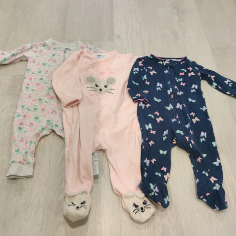 Myydään viiden yöasun paketti. Koot 68-74cm. Siistit ja ehjät. Yksi lyhythihainen. Vetoketju- ja nappikiinnityksiä.