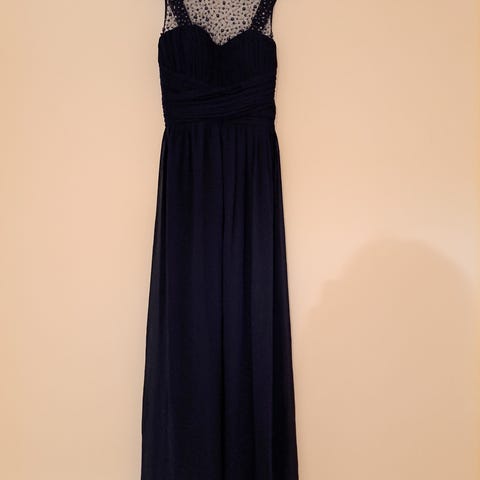 Myydään kerran käytetty tummansininen juhlava, upea iltapuku. Merkki Mascara London. Koko 42. Puku on päältä sifonkia, aluskangas satiinia. Helmassa on hienostuneena yksityiskohtana halkio. Vetoketjukiinnitys. Mekkoon kuuluu läpinäkyvät hihat.