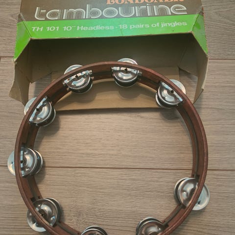 Tamburiini, jossa on puinen kehys ja metalliset kellot. Sopii musiikin soittamiseen ja rytmin luomiseen. Kevyt ja käsin pidettävä malli.