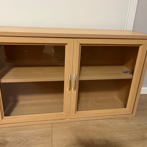Myydään muuton tieltä lasivitriini ja hylly. Hylly on kuvassa pystysuorassa.