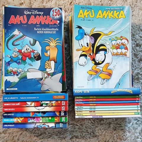 Akkareita ja Roope Setiä, taskukirjoja ja lehtiä 4 kassillista. Vaihtuu kahvipakettiin. Vain nouto.