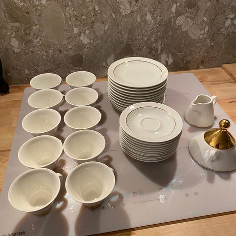 Harlekiini Gold kahviastiasto. 13 kuppia asetilla ja leipälautasella sekä sokerikko ja kermakko.Vain nouto Ruutana/Tampere.