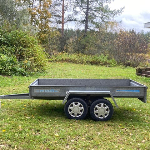 Hyväkuntoinen muulikärry 1250L jossa korokelaidat, kuomu, nokkapyörä ja uudet renkaat