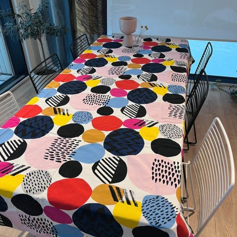 Ikean design kangasta vuoden 2005 mallistosta. Ommeltu ylä ja alareunoista. Huom! Mitat ovat arvio!