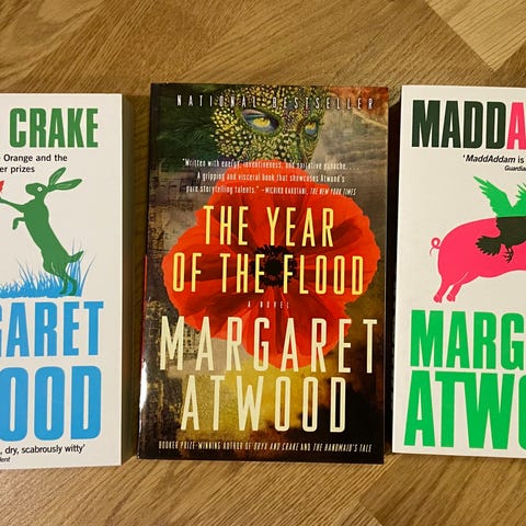 Myynnissä kuvissa näkyvä erittäin hyväkuntoinen, nidottu Margaret Atwoodin teos Oryx ja Crake.