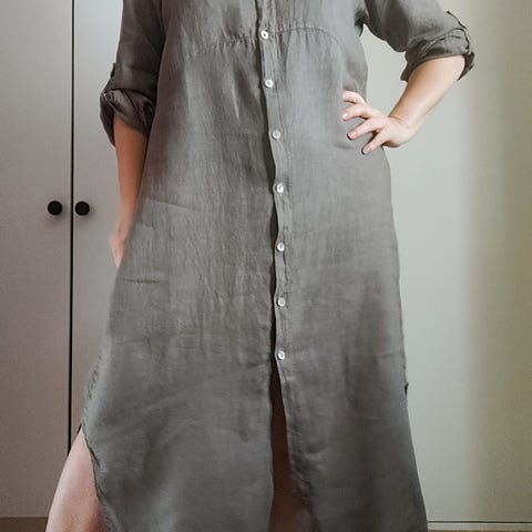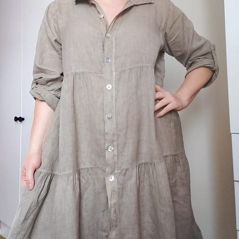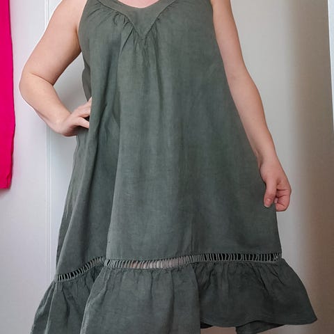 Keskisininen ihana Made in Italy pellavamekko, one size. Kai-kai n 58 cm suoraksi vedettynä ja olka-helma n 120 cm edestä ja takaa vähän pidempi. Taskut sivusaumoissa.