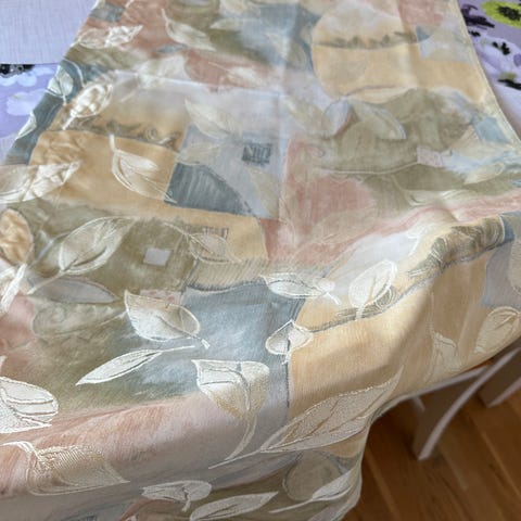 Karkeaa luonnonsilkkiä. Korkeus n. 45 cm. Voi ripustaa tarraan tai nipsuilla kiskoon tai renkailla tankoon. Nouto Tesomalta sovitusti tai postitus mieluiten ToriDiilillä.