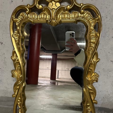 Myynnissä upea, aito vanha koristepeili kultaisella rokokoohenkisellä kehyksellä.